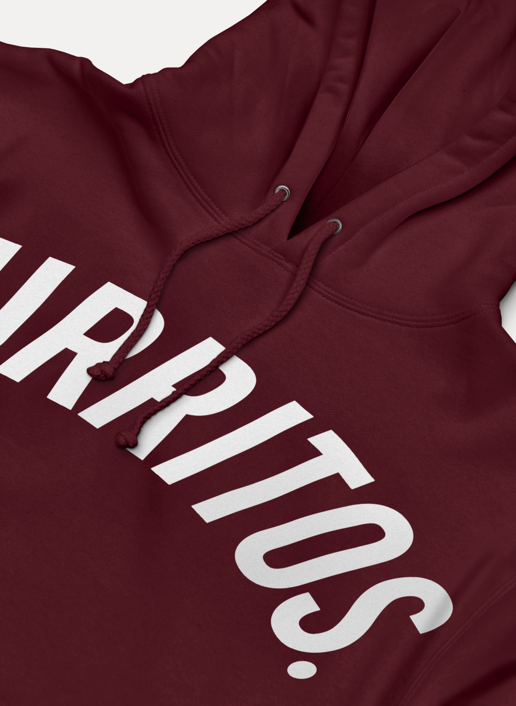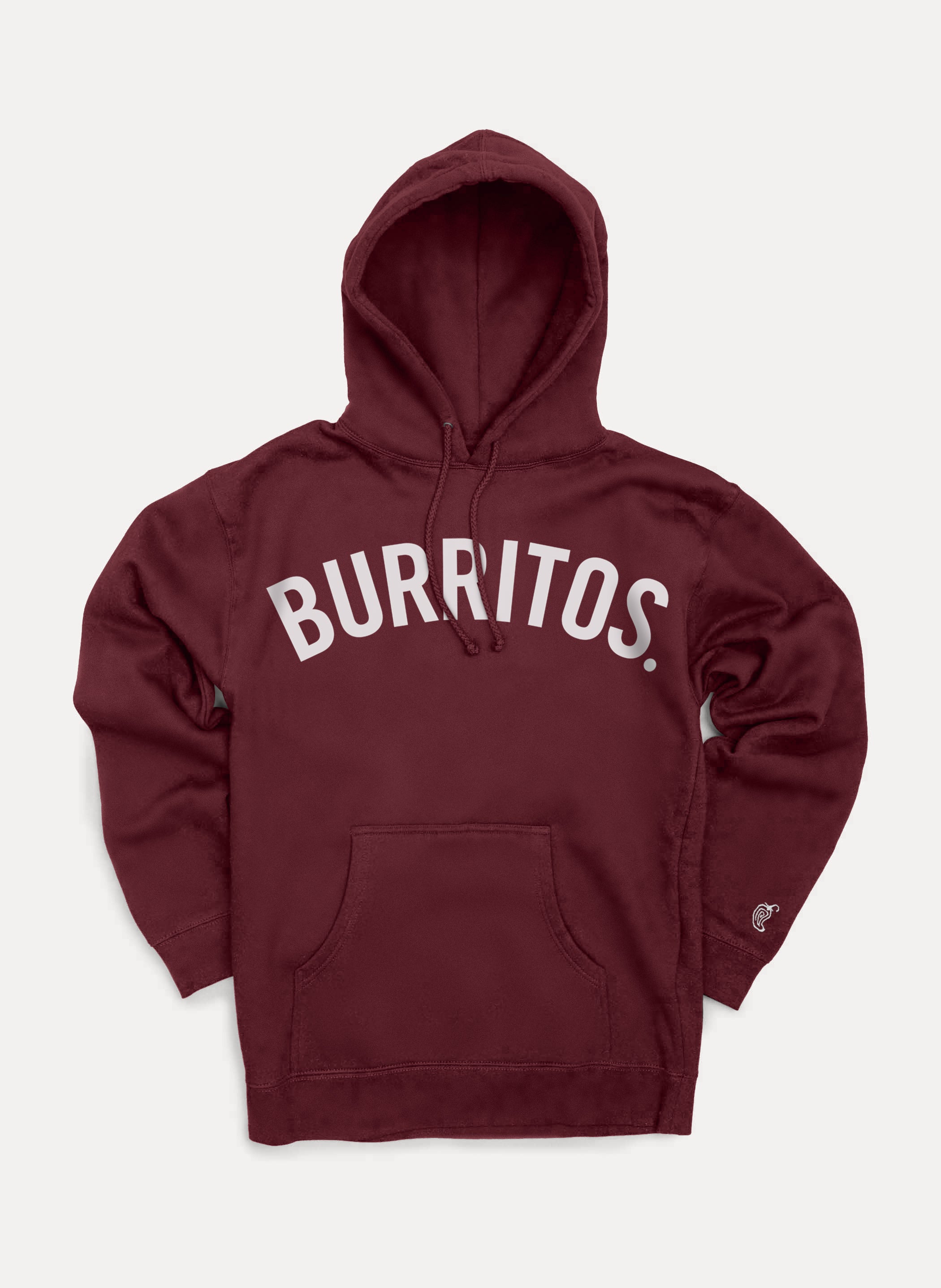 Burritos for the win. Embroidered pepper on the sleeve. Classic style hoodie made from soft, thick fleece. This is a pre-order item.